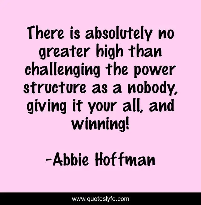 This page presents the quote "There is absolutely no greater high than challenging the power structure as a nobody, giving it your all, and winning!". Author of this quote is Abbie Hoffman. This quote is about dissent, activism, protest, success, inspiration,.