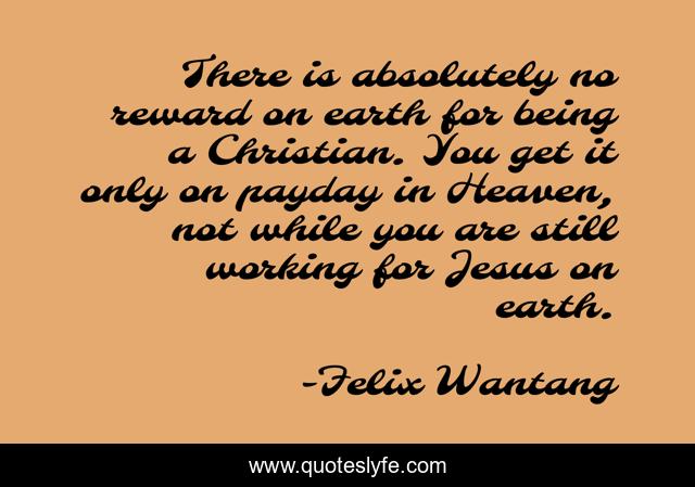 This page presents the quote "There is absolutely no reward on earth for being a Christian. You get it only on payday in Heaven, not while you are still working for Jesus on earth.". Author of this quote is Felix Wantang. This quote is about payday, reward, jesus,.