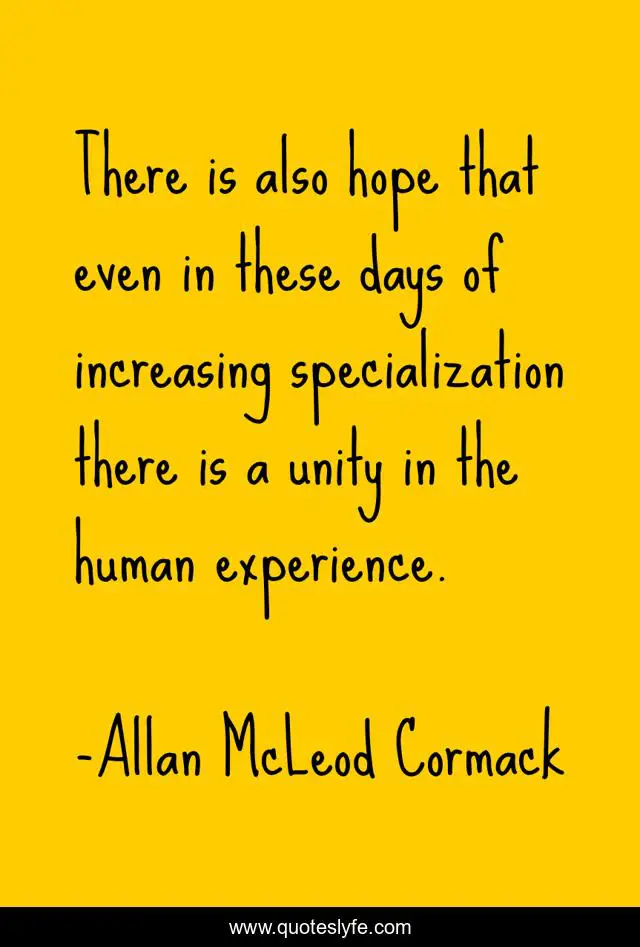 This page presents the quote "There is also hope that even in these days of increasing specialization there is a unity in the human experience.". Author of this quote is Allan McLeod Cormack. This quote is about human-experience, specialization, nobel-laureate, science, experience, unity, nobel-speech, human, hope,.