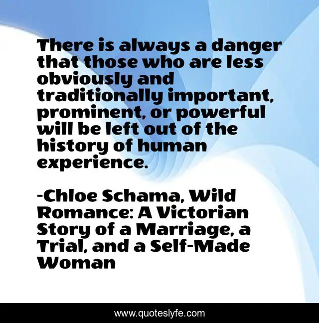 This page presents the quote "There is always a danger that those who are less obviously and traditionally important, prominent, or powerful will be left out of the history of human experience.". Author of this quote is Chloe Schama, Wild Romance: A Victorian Story of a Marriage, a Trial, and a Self-Made Woman. This quote is about historical-romance, true-crime, romance, nonfiction, historical, biography, history,.