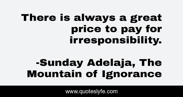 This page presents the quote "There is always a great price to pay for irresponsibility.". Author of this quote is Sunday Adelaja, The Mountain of Ignorance. This quote is about mountain, life, irresponsibility, darkness, power, danger, god, irresponsible, responsible,.