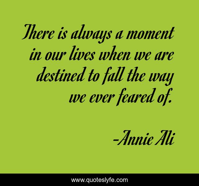 This page presents the quote "There is always a moment in our lives when we are destined to fall the way we ever feared of.". Author of this quote is Annie Ali. This quote is about fate, humans, lucky, mistakes, way, fear,.