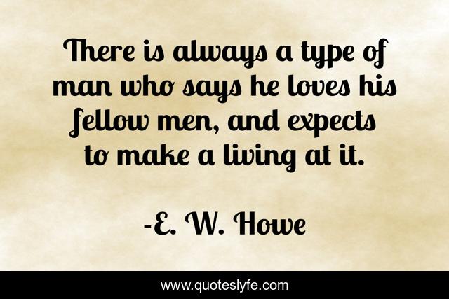 This page presents the quote "There is always a type of man who says he loves his fellow men, and expects to make a living at it.". Author of this quote is E. W. Howe. This quote is about always, man, living,.