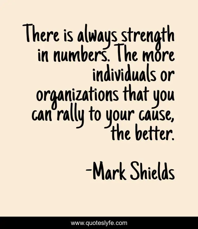 This page presents the quote "There is always strength in numbers. The more individuals or organizations that you can rally to your cause, the better.". Author of this quote is Mark Shields. This quote is about better, numbers,.