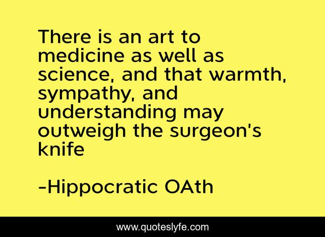 This page presents the quote "There is an art to medicine as well as science, and that warmth, sympathy, and understanding may outweigh the surgeon’s knife". Author of this quote is Hippocratic OAth. This quote is about medicine, doctor,.