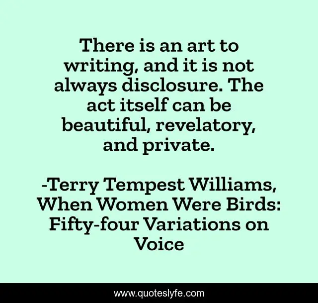This page presents the quote "There is an art to writing, and it is not always disclosure. The act itself can be beautiful, revelatory, and private.". Author of this quote is Terry Tempest Williams, When Women Were Birds: Fifty-four Variations on Voice. This quote is about art, beauty, private, writing, disclusure, voice, silence, privicy,.