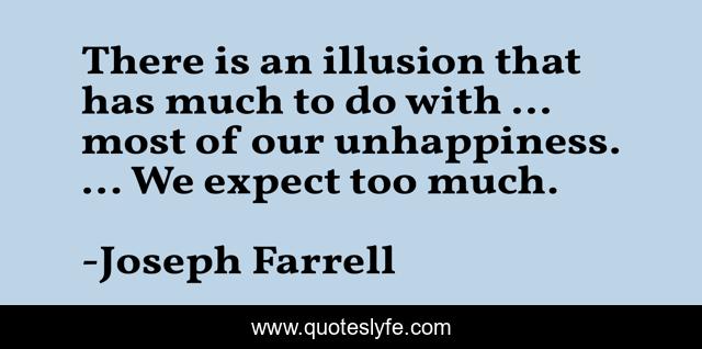This page presents the quote "There is an illusion that has much to do with ... most of our unhappiness. ... We expect too much.". Author of this quote is Joseph Farrell. This quote is about realistic, expectations,.
