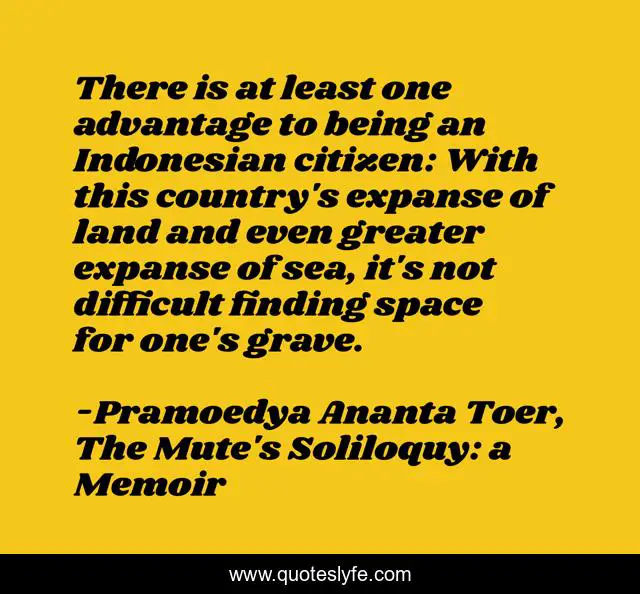 This page presents the quote "There is at least one advantage to being an Indonesian citizen: With this country's expanse of land and even greater expanse of sea, it's not difficult finding space for one's grave.". Author of this quote is Pramoedya Ananta Toer, The Mute's Soliloquy: a Memoir. This quote is about indonesian, irony, indonesia, expansion, citizen, nationalism, grave,.