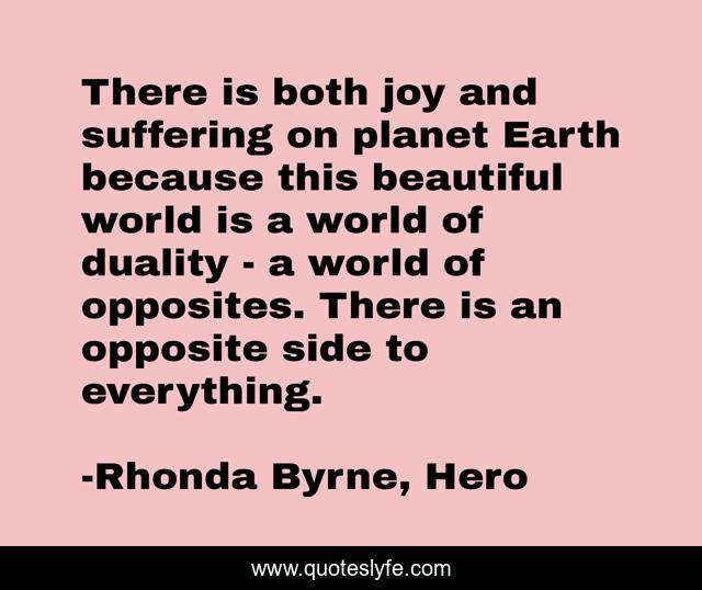 This page presents the quote "There is both joy and suffering on planet Earth because this beautiful world is a world of duality - a world of opposites. There is an opposite side to everything.". Author of this quote is Rhonda Byrne, Hero. This quote is about beautiful, hero, inspire, opposite, law-of-attraction, philosophy, the-secret, new, wisdom,.