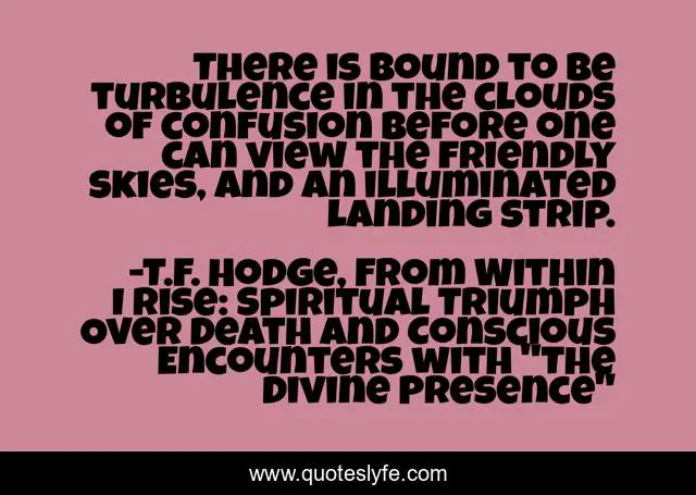 This page presents the quote "There is bound to be turbulence in the clouds of confusion before one can view the friendly skies, and an illuminated landing strip.". Author of this quote is T.F. Hodge, From Within I Rise: Spiritual Triumph Over Death and Conscious Encounters with "The Divine Presence". This quote is about clouds, illuminate, confusion, sky, quotes, turbulence, friend,.