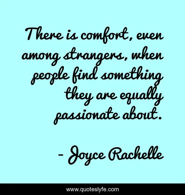 This page presents the quote "There is comfort, even among strangers, when people find something they are equally passionate about.". Author of this quote is Joyce Rachelle. This quote is about book-group, book-club, better-together, passion, hobbies, finding-your-passion, likes-and-dislikes, friends,.