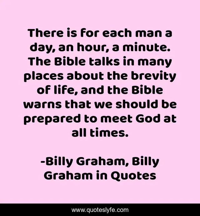 This page presents the quote "There is for each man a day, an hour, a minute. The Bible talks in many places about the brevity of life, and the Bible warns that we should be prepared to meet God at all times.". Author of this quote is Billy Graham, Billy Graham in Quotes. This quote is about billy-graham, time,.