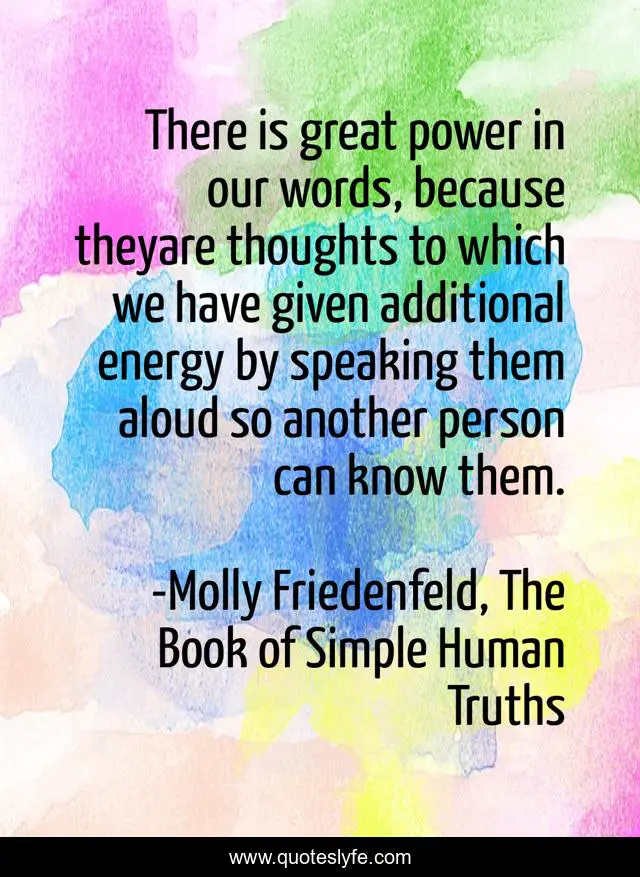This page presents the quote "There is great power in our words, because theyare thoughts to which we have given additional energy by speaking them aloud so another person can know them.". Author of this quote is Molly Friedenfeld, The Book of Simple Human Truths. This quote is about love, truth, inspirational, joy, peace, wisdom, thoughts, unconditional-love, positive-thoughts,.