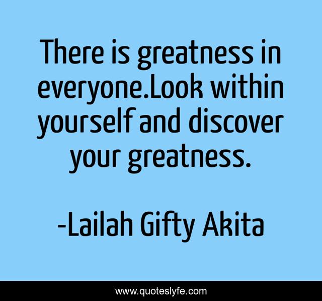 This page presents the quote "There is greatness in everyone.Look within yourself and discover your greatness.". Author of this quote is Lailah Gifty Akita. This quote is about look, discovering-yourself, looking-forward, discovery-of-oneself, great-expectations, discover, yourself, great-glory, greatness,.