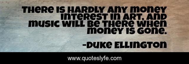 This page presents the quote "There is hardly any money interest in art, and music will be there when money is gone.". Author of this quote is Duke Ellington. This quote is about money, art, interest,.