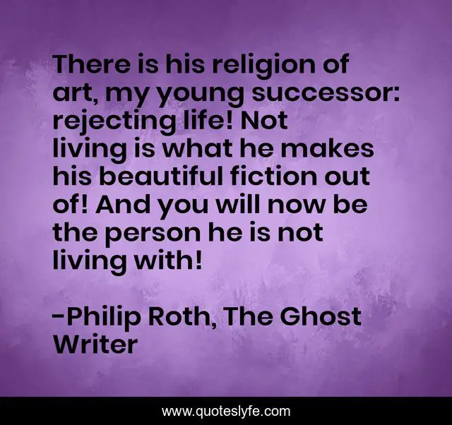 This page presents the quote "There is his religion of art, my young successor: rejecting life! Not living is what he makes his beautiful fiction out of! And you will now be the person he is not living with!". Author of this quote is Philip Roth, The Ghost Writer. This quote is about writer, life-of-a-writer, writing,.