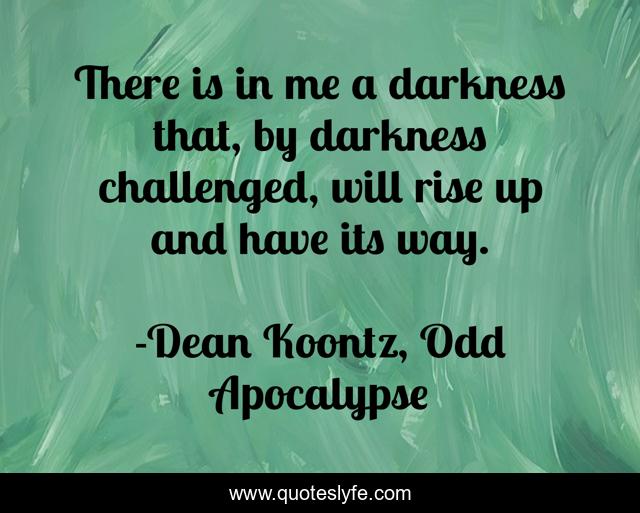 This page presents the quote "There is in me a darkness that, by darkness challenged, will rise up and have its way.". Author of this quote is Dean Koontz, Odd Apocalypse. This quote is about darkness, odd-thomas, challenged,.