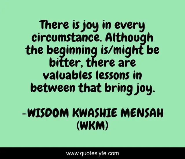 This page presents the quote "There is joy in every circumstance. Although the beginning is/might be bitter, there are valuables lessons in between that bring joy.". Author of this quote is WISDOM KWASHIE MENSAH (WKM). This quote is about lessons, motivation, wkm, inspirational, joy, endurance, whrm-whm, appreciation, hqm,.