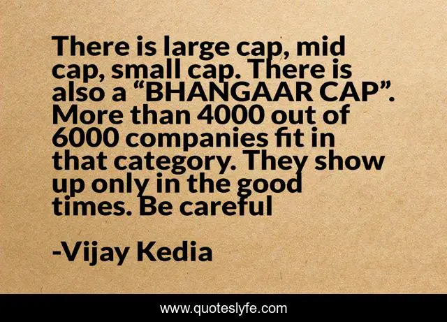 This page presents the quote "There is large cap, mid cap, small cap. There is also a “BHANGAAR CAP”. More than 4000 out of 6000 companies fit in that category. They show up only in the good times. Be careful". Author of this quote is Vijay Kedia. This quote is about business-advice, business, stock-market, inspirational, enthusiasm, business-culture,.