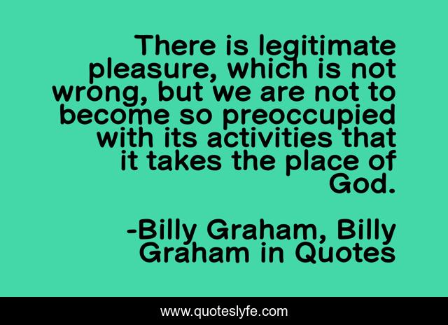 This page presents the quote "There is legitimate pleasure, which is not wrong, but we are not to become so preoccupied with its activities that it takes the place of God.". Author of this quote is Billy Graham, Billy Graham in Quotes. This quote is about pleasure, billy-graham,.