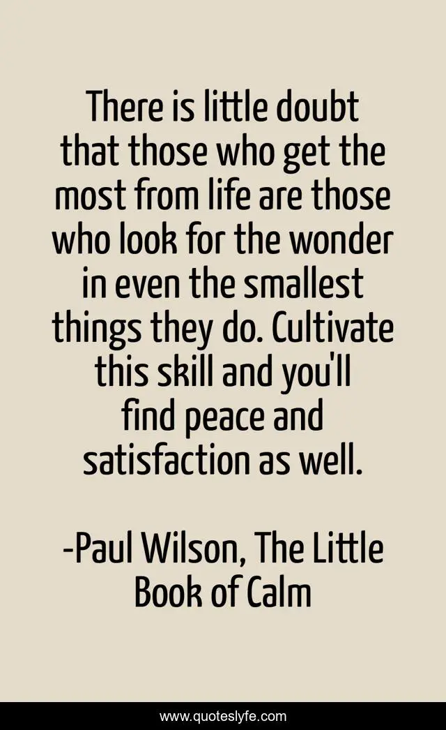This page presents the quote "There is little doubt that those who get the most from life are those who look for the wonder in even the smallest things they do. Cultivate this skill and you'll find peace and satisfaction as well.". Author of this quote is Paul Wilson, The Little Book of Calm. This quote is about peace-of-mind, peace, calm,.