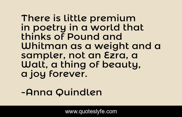 This page presents the quote "There is little premium in poetry in a world that thinks of Pound and Whitman as a weight and a sampler, not an Ezra, a Walt, a thing of beauty, a joy forever.". Author of this quote is Anna Quindlen. This quote is about joy, poetry, world,.