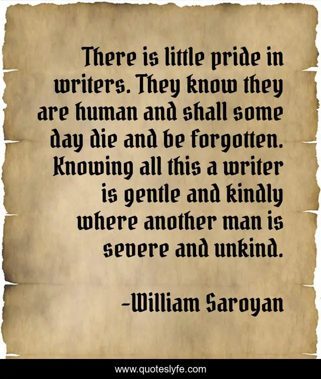 This page presents the quote "There is little pride in writers. They know they are human and shall some day die and be forgotten. Knowing all this a writer is gentle and kindly where another man is severe and unkind.". Author of this quote is William Saroyan. .