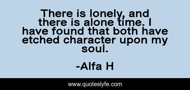 This page presents the quote "There is lonely, and there is alone time. I have found that both have etched character upon my soul.". Author of this quote is Alfa H. This quote is about lonely, strong-woman, character, strength, alone-but-not-lonely, resilience,.
