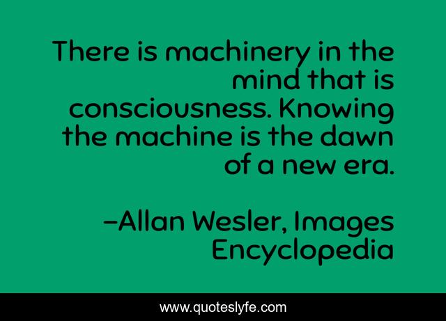 This page presents the quote "There is machinery in the mind that is consciousness. Knowing the machine is the dawn of a new era.". Author of this quote is Allan Wesler, Images Encyclopedia. This quote is about psychology, myth, mother-goddess, philosophy, sacred-mountain, religion, history,.