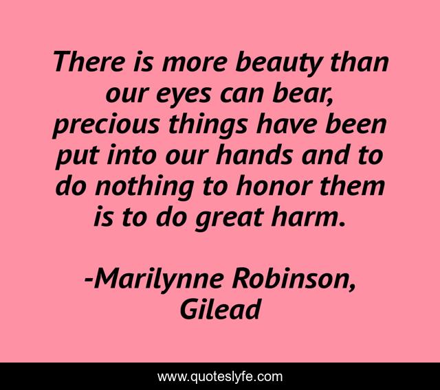 This page presents the quote "There is more beauty than our eyes can bear, precious things have been put into our hands and to do nothing to honor them is to do great harm.". Author of this quote is Marilynne Robinson, Gilead. This quote is about eyes, brave, deception, grace, beauty, world, fortitude, life, stewardship,.