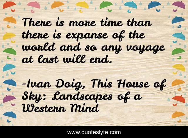 This page presents the quote "There is more time than there is expanse of the world and so any voyage at last will end.". Author of this quote is Ivan Doig, This House of Sky: Landscapes of a Western Mind. This quote is about travel, time,.