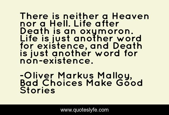 This page presents the quote "There is neither a Heaven nor a Hell. Life after Death is an oxymoron. Life is just another word for existence, and Death is just another word for non-existence.". Author of this quote is Oliver Markus Malloy, Bad Choices Make Good Stories. This quote is about atheism, life, death, heaven-and-hell, religion, life-after-death, life-lessons, hell, death-and-dying,.