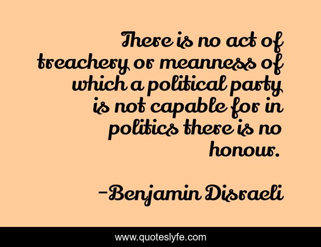 This page presents the quote "There is no act of treachery or meanness of which a political party is not capable for in politics there is no honour.". Author of this quote is Benjamin Disraeli. This quote is about party, political,.