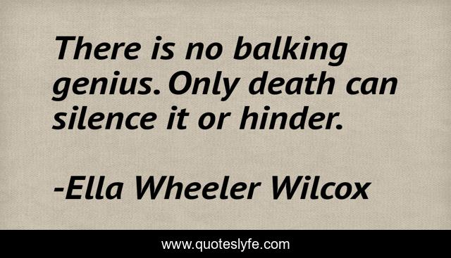 This page presents the quote "There is no balking genius. Only death can silence it or hinder.". Author of this quote is Ella Wheeler Wilcox. This quote is about self, acceptance,.