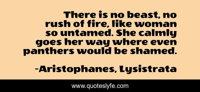This page presents the quote "There is no beast, no rush of fire, like woman so untamed. She calmly goes her way where even panthers would be shamed.". Author of this quote is Aristophanes, Lysistrata. This quote is about enthusiasm, confidence, feminism, empowerment, inspirational,.