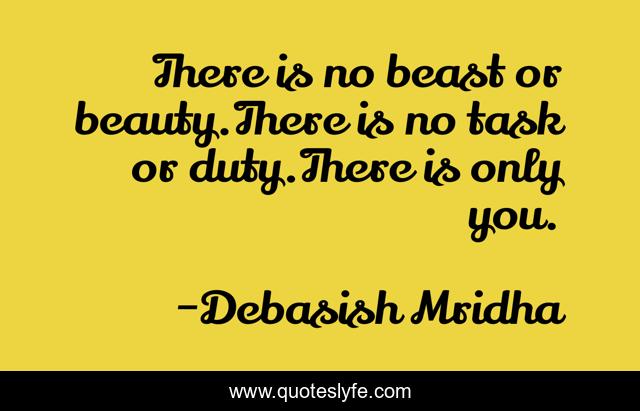 This page presents the quote "There is no beast or beauty.There is no task or duty.There is only you.". Author of this quote is Debasish Mridha. This quote is about life, love, knowledge, inspirational, intelligence, philosophy, wisdom, quotes, affection,.