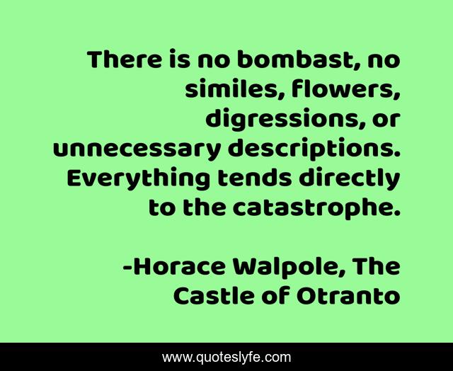 This page presents the quote "There is no bombast, no similes, flowers, digressions, or unnecessary descriptions. Everything tends directly to the catastrophe.". Author of this quote is Horace Walpole, The Castle of Otranto. This quote is about writing-craft, writing-style,.