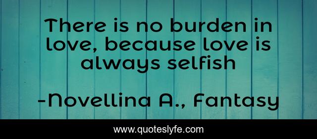 This page presents the quote "There is no burden in love, because love is always selfish". Author of this quote is Novellina A., Fantasy. This quote is about inspirational-love, hurt,.