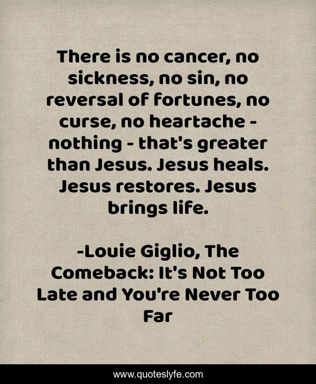 This page presents the quote "There is no cancer, no sickness, no sin, no reversal of fortunes, no curse, no heartache - nothing - that's greater than Jesus. Jesus heals. Jesus restores. Jesus brings life.". Author of this quote is Louie Giglio, The Comeback: It's Not Too Late and You're Never Too Far. This quote is about heartache, jesus-christ, christianity,.