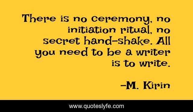 This page presents the quote "There is no ceremony, no initiation ritual, no secret hand-shake. All you need to be a writer is to write.". Author of this quote is M. Kirin. This quote is about writers-on-writing, writer-inspiration, writing-advice, inspiration, writing,.