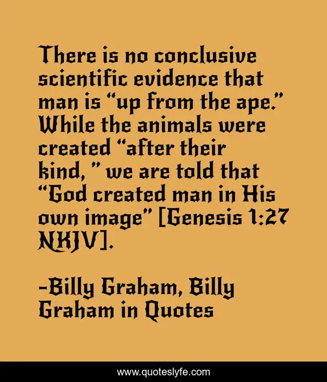 This page presents the quote "There is no conclusive scientific evidence that man is “up from the ape.” While the animals were created “after their kind, ” we are told that “God created man in His own image” [Genesis 1:27 NKJV].". Author of this quote is Billy Graham, Billy Graham in Quotes. This quote is about creation, billy-graham,.