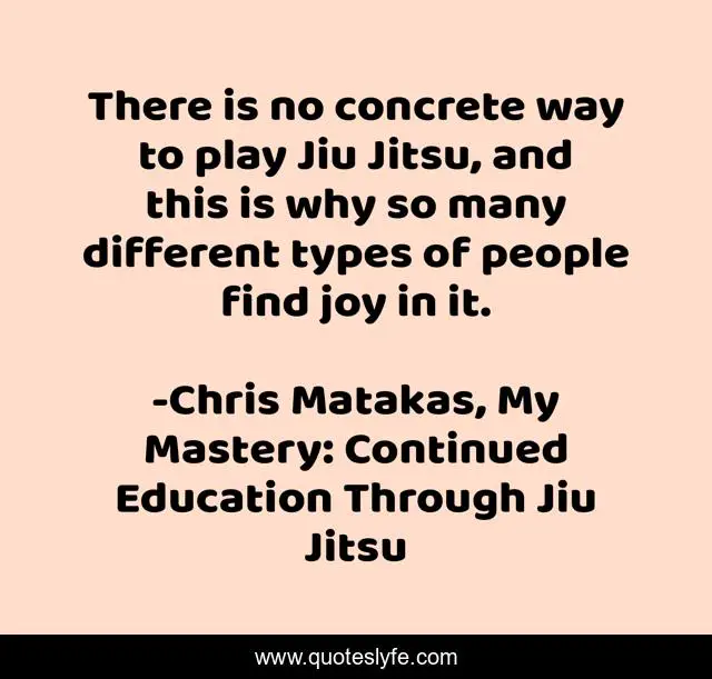 This page presents the quote "There is no concrete way to play Jiu Jitsu, and this is why so many different types of people find joy in it.". Author of this quote is Chris Matakas, My Mastery: Continued Education Through Jiu Jitsu. This quote is about learning, jiu-jitsu, martial-arts, student, bjj,.