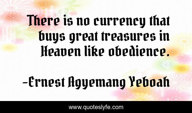 This page presents the quote "There is no currency that buys great treasures in Heaven like obedience.". Author of this quote is Ernest Agyemang Yeboah. This quote is about obeying-god, doing-god-s-work, heaven, obedience,.