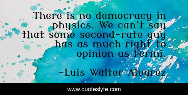 This page presents the quote "There is no democracy in physics. We can't say that some second-rate guy has as much right to opinion as Fermi.". Author of this quote is Luis Walter Alvarez. This quote is about democracy, rights, science, enrico-fermi, opinion, physics,.