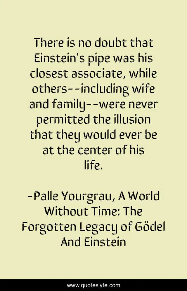 This page presents the quote "There is no doubt that Einstein's pipe was his closest associate, while others--including wife and family--were never permitted the illusion that they would ever be at the center of his life.". Author of this quote is Palle Yourgrau, A World Without Time: The Forgotten Legacy of Gödel And Einstein. This quote is about isolationist, reality, popular-image, loner, genius, popular-misconception, einstein, troubled,.