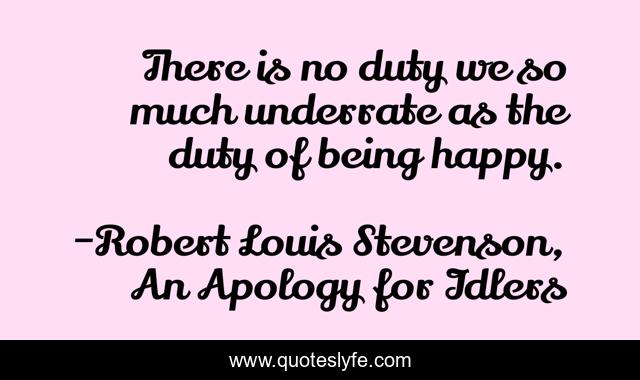This page presents the quote "There is no duty we so much underrate as the duty of being happy.". Author of this quote is Robert Louis Stevenson, An Apology for Idlers. This quote is about happiness, inspiration,.