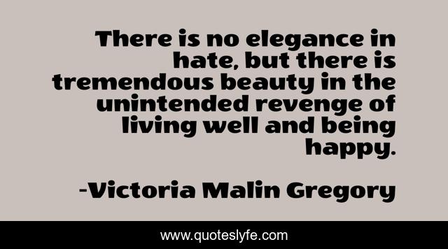 This page presents the quote "There is no elegance in hate, but there is tremendous beauty in the unintended revenge of living well and being happy.". Author of this quote is Victoria Malin Gregory. This quote is about retribution, beauty, loathing, revenge, reprisal, vengeance, healing, hate, happy,.