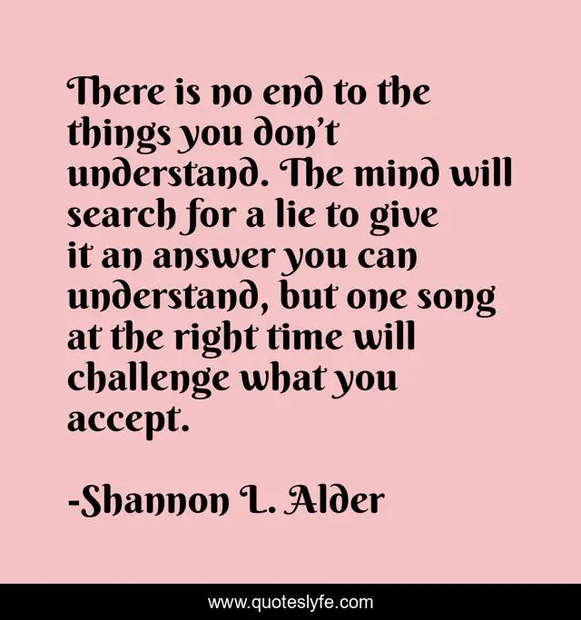 This page presents the quote "There is no end to the things you don’t understand. The mind will search for a lie to give it an answer you can understand, but one song at the right time will challenge what you accept.". Author of this quote is Shannon L. Alder. This quote is about faith, unexplained, faithfullness, mystery-novels, no-answers, beliefs, acceptance, moved, not-understanding,.