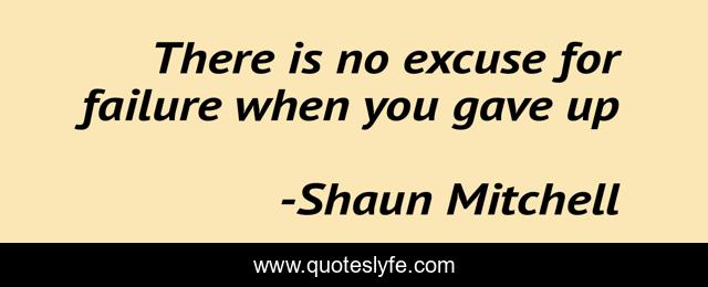This page presents the quote "There is no excuse for failure when you gave up". Author of this quote is Shaun Mitchell. This quote is about confidence, positive, no-excuses, motivational, determination, optimistic, inspirational, enthusiasm,.