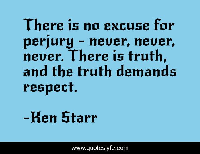 This page presents the quote "There is no excuse for perjury - never, never, never. There is truth, and the truth demands respect.". Author of this quote is Ken Starr. This quote is about excuse, truth,.